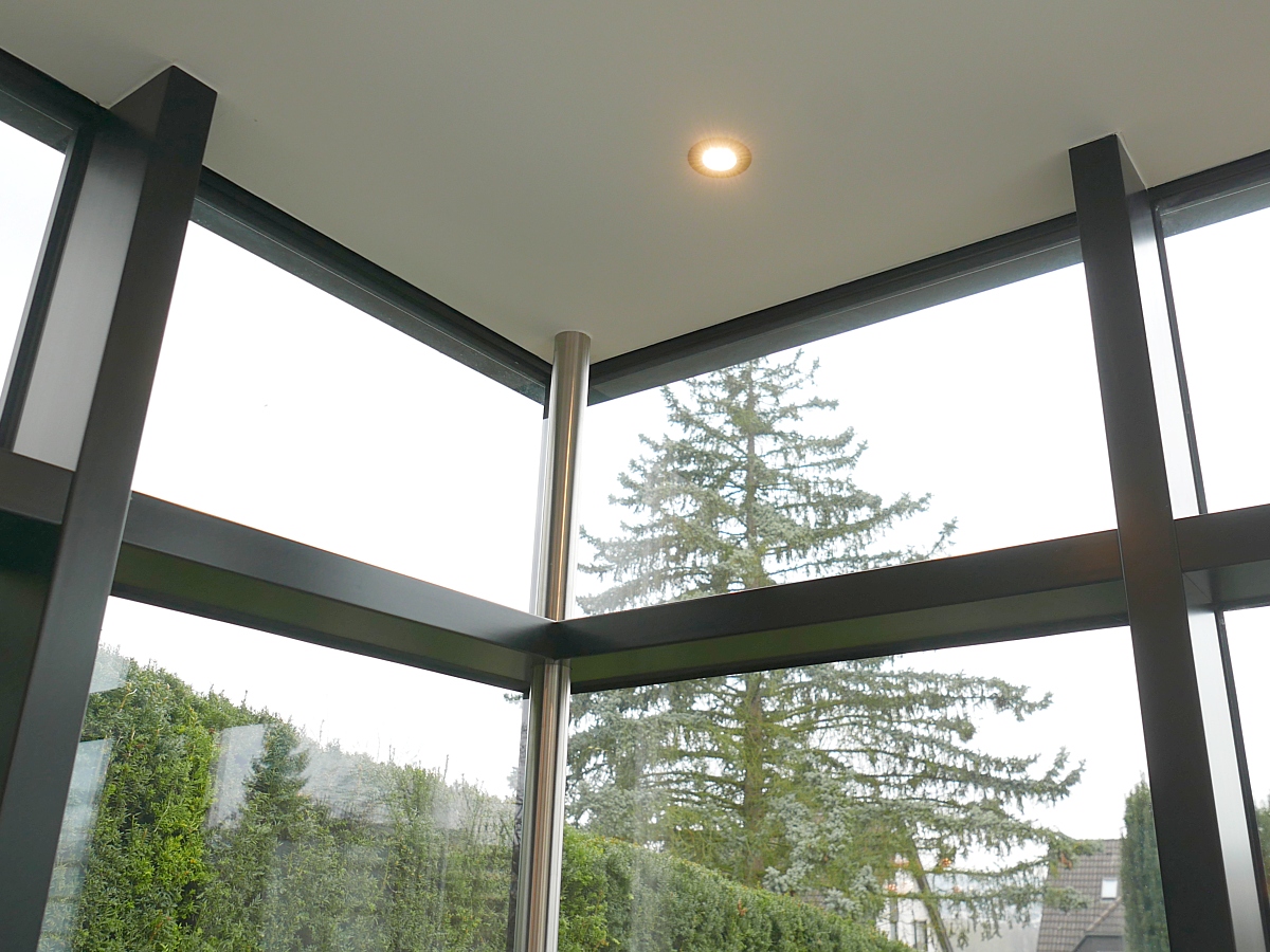 The large panoramic windows, framed in very slim, load-bearing profiles, and the all-glass corners with internal stainless steel support, underline the exclusivity of this fine flat roof winter garden with a glass dome. |